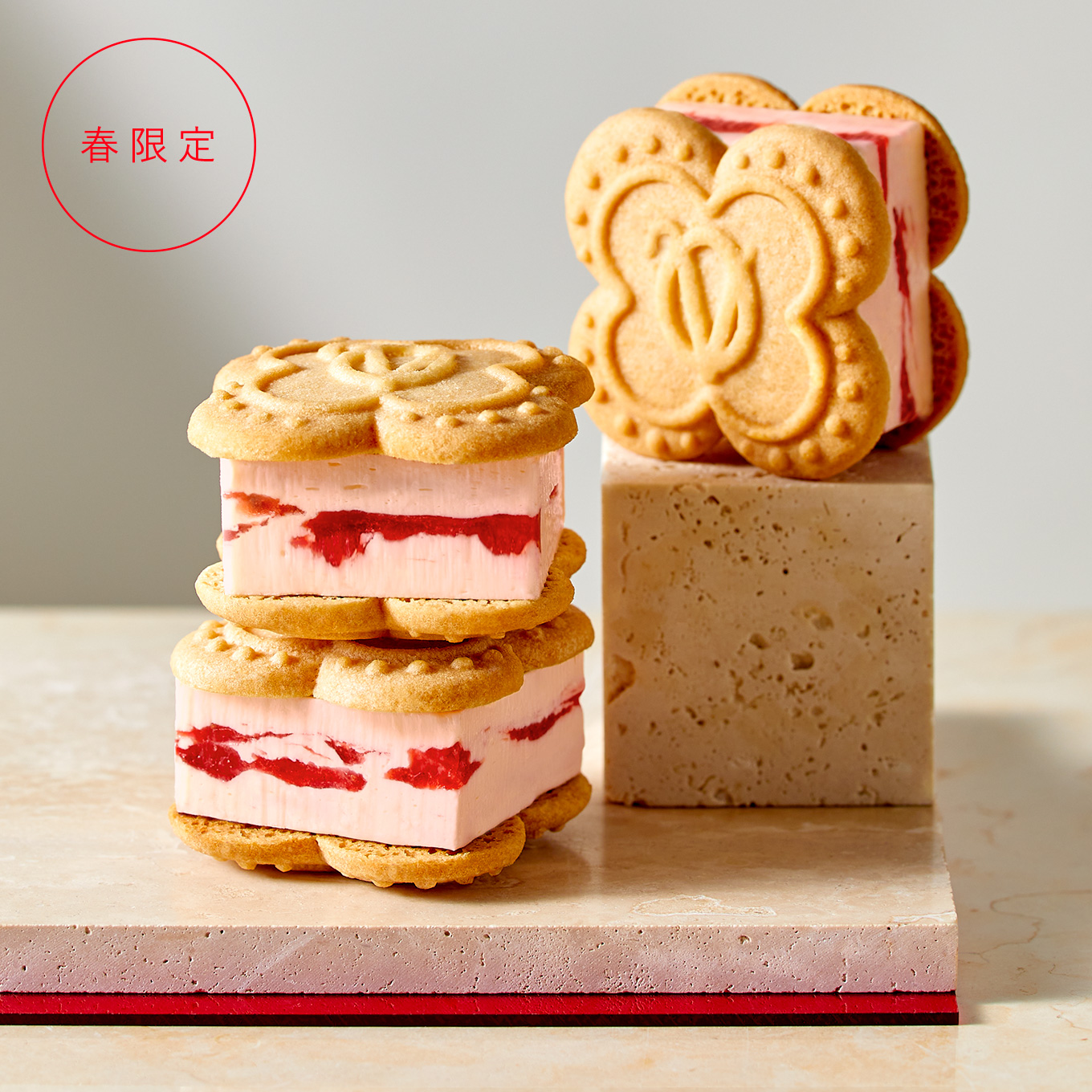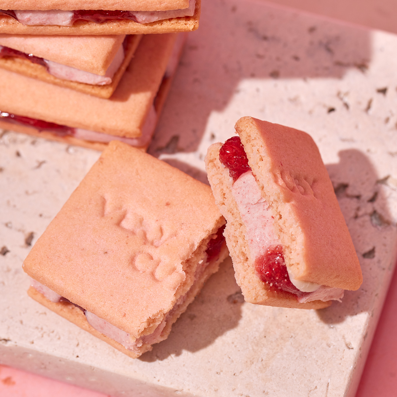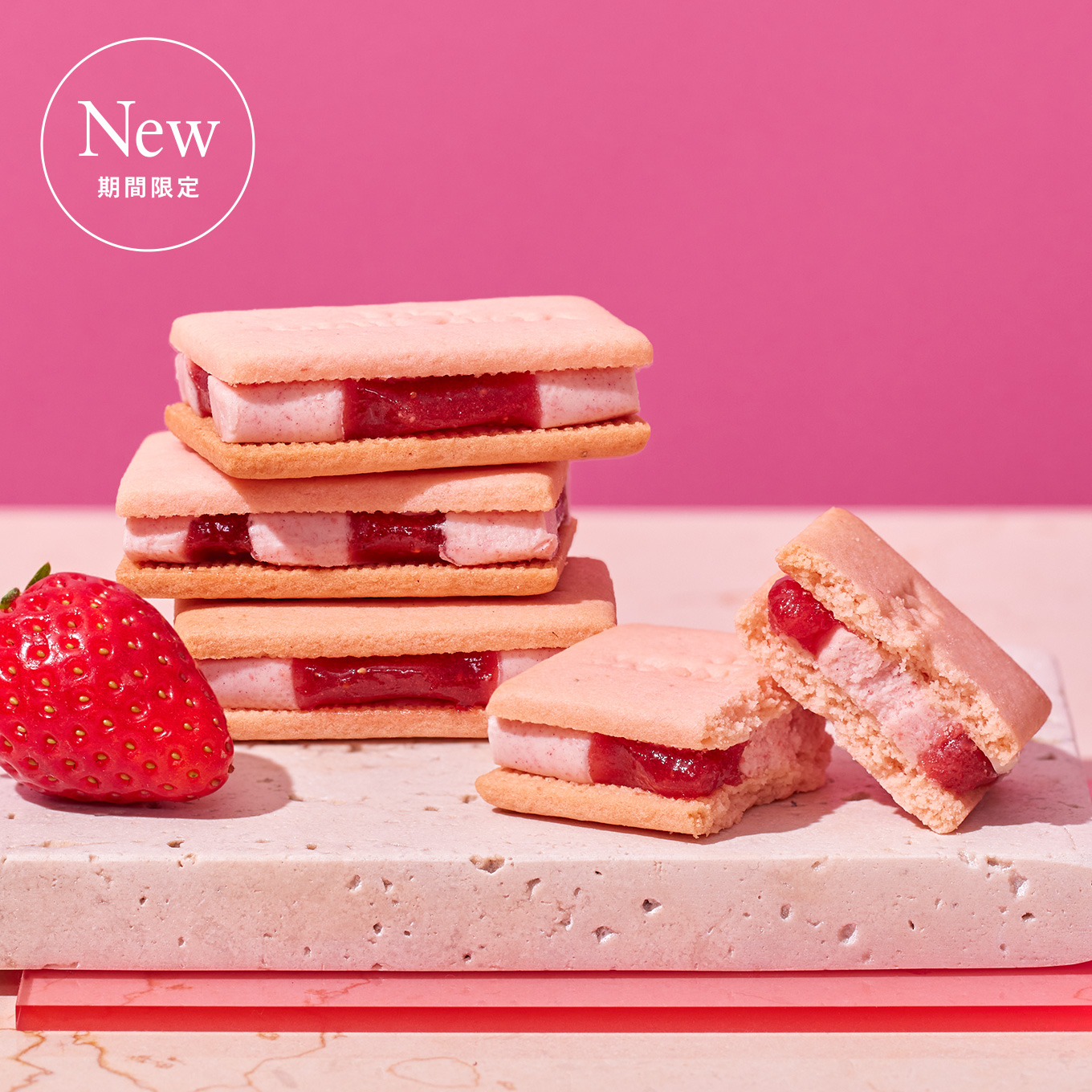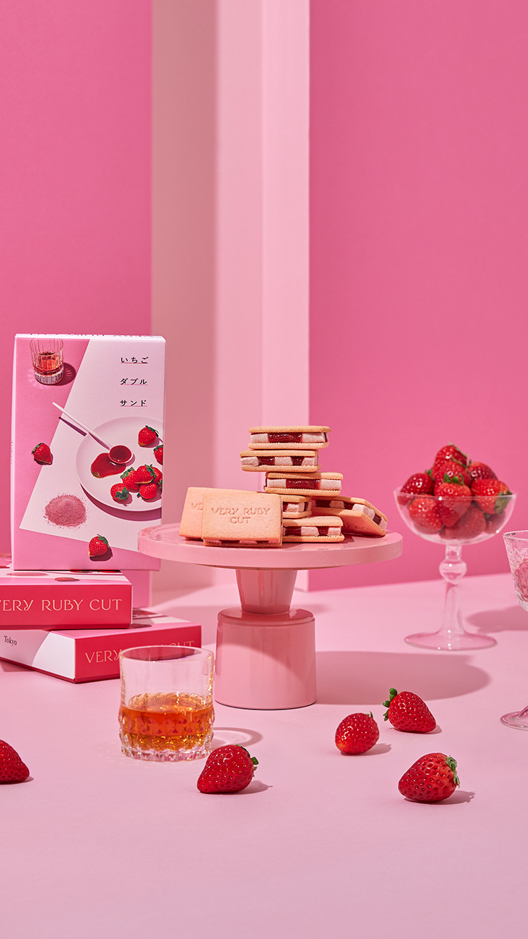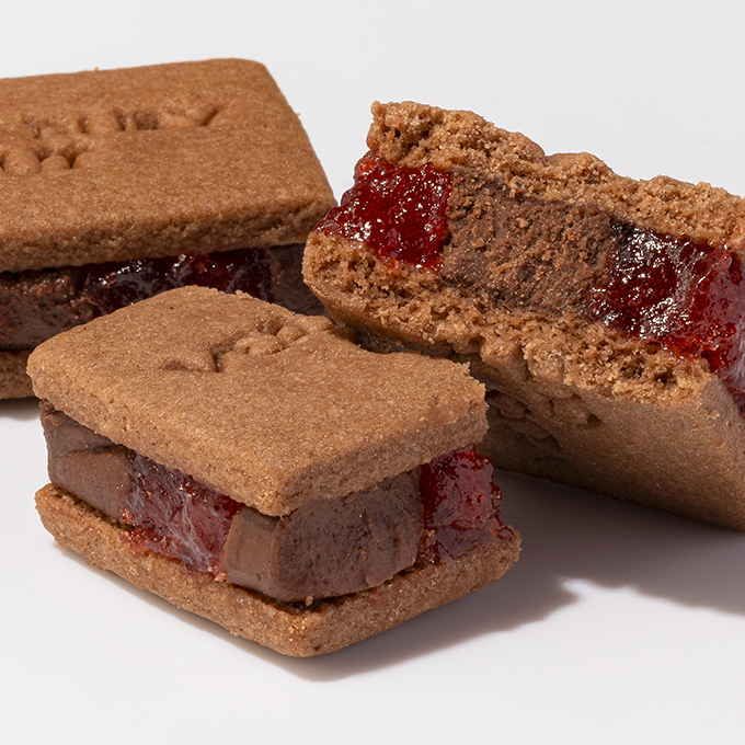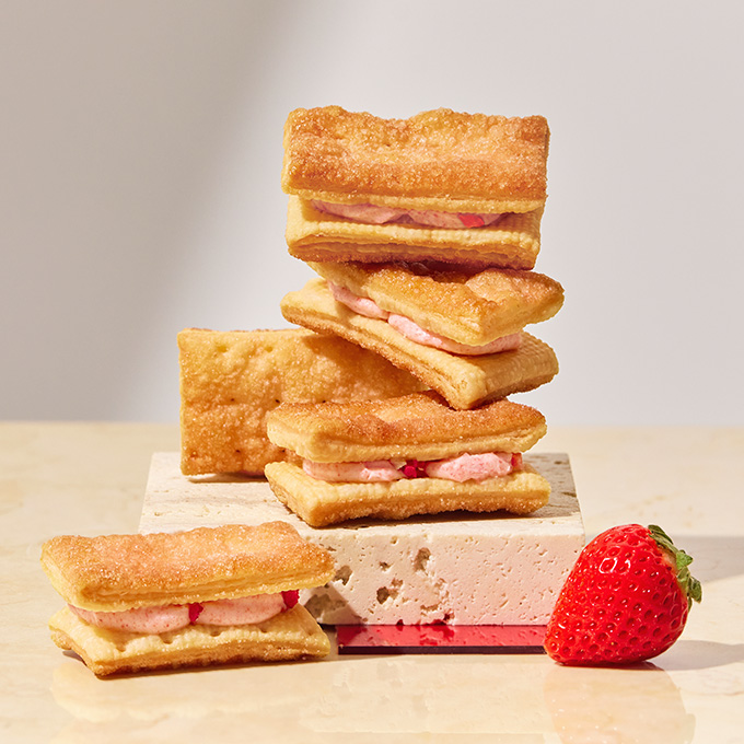 素晴らしい香りが特徴の苺「サンアンドレアス種」の果肉を苺のピューレで煮込み、苺本来の甘みと酸味を味わえるコンフィチュールジュレに。さらに、濃厚なコクのホイップバタークリームを混ぜ、発酵バター香るクッキーで、 贅沢な厚みのままはさみました。